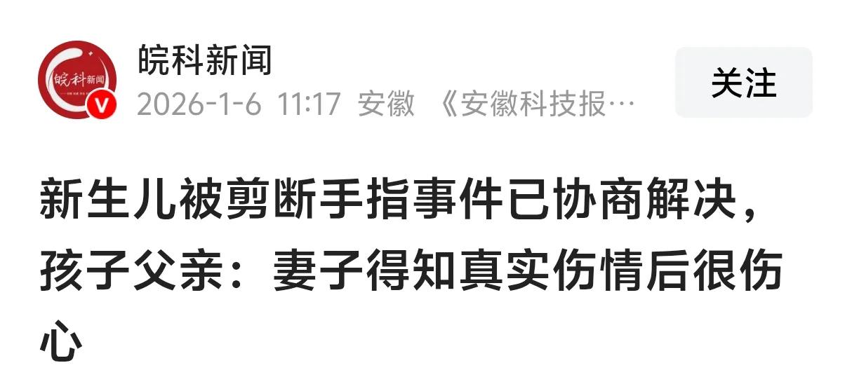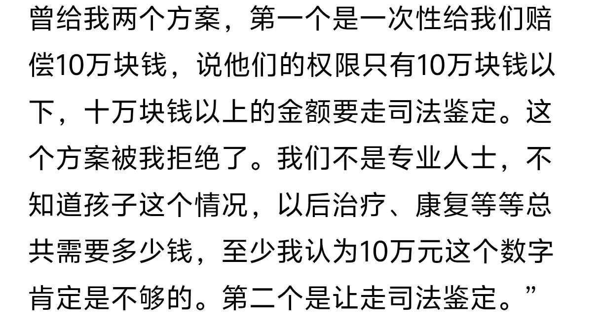从最新的后续得知,该事件已协商解决,盛先生的妻子得知孩子的真实伤情后很心疼很伤心。医院给出的方案是给10万赔偿,如果盛先生同意就好,不同意的话再申请司法鉴定。后来盛先生觉得十万块钱是不够的就申请了司法鉴定。