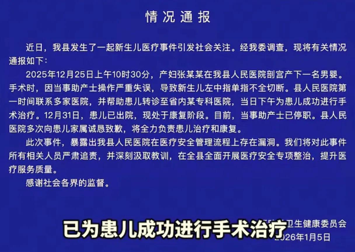 盛先生把此事发布到网上。希望得到网友们的支持,也引发了大家的共情。当地的相关部门把该名助产士停职。医院方面向新生儿一家道歉,并承诺会给出相应赔偿。
