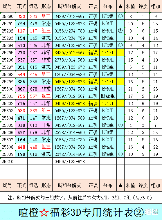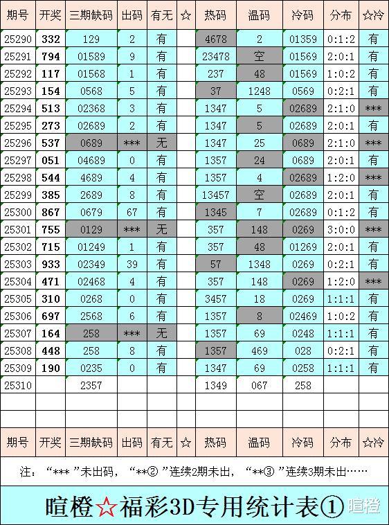 25310期:暄橙福彩3D综合条件(本期将在11月20日21:15开)一、上期回顾 ☆1、上期开奖号:1 9 0。2、和值= 10,跨度= 9。3、常态组六,001路组合。4、热度分布(热:温:冷)1:1:1。二、本期条件 ☆1、三期缺码:2357。2、热:1349,温:067,冷:258。3、断组分解式:0459//123-678。4、四胆:3789;三胆:378。三、术语解释 ☆1、三期缺码:0至9这十个自然数当中,未在近三期开奖号出现的数字。2、热度(热温冷):自然数0至9,在近七期开奖号中,出现3次及3次以上的数字,称为热码;出现2次的数字,称为温码;出现1次和未出现的数字,称为冷码。某个数字在开奖号中出现几个,就按几次计算。3、断组分解式:将0至9这十个自然数,分成三组数字,从前往后依次为A组(4码)、B组(3码)、C组(3码),一般情况下,有一组数字不出码,偶尔会有两组数字不出码。A组不出码的情况相对较少。断组为主,分解为辅。4、常态组六号码:同时包含大数、小数、奇数、偶数、质数、合数的组六号码,共有72注。统计表中,简称“常态”。5、非常态组六号码:全大数、全小数、全奇数、全偶数、全质数、全合数等六种形态的组六号码,共有48注。统计表中,简称“非常”。★提醒:彩市有风险,参与须谨慎!理性购彩,量力而行!多看少买,不要痴迷!任何条件都有出错的时候!水平有限,仅供参考!友好互动,好运相伴!
