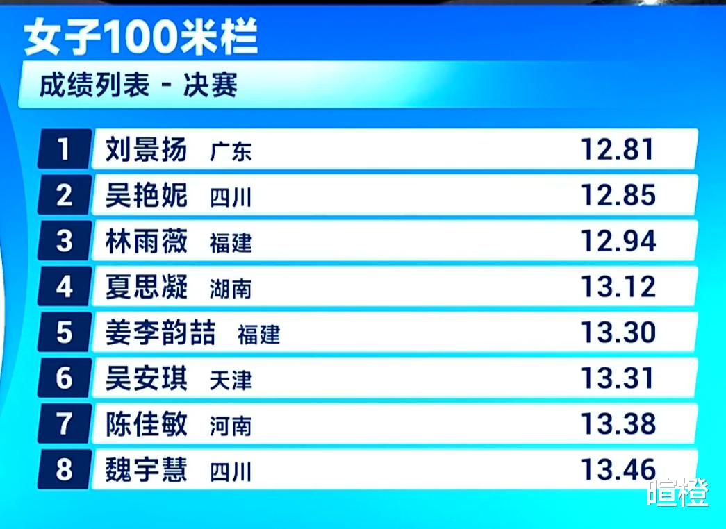 2025年11月19日,第十五届全国运动会田径女子100米栏决赛成绩列表。