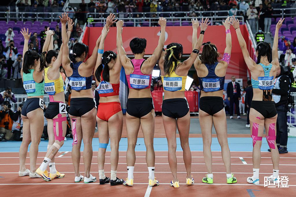 2025年11月19日,第十五届全国运动会田径女子100米栏决赛,参赛运动员合影(左起):吴安琪(天津队)、吴艳妮(四川队)、林雨薇(福建队)、刘景扬(广东队)、陈佳敏(河南队)、魏宇慧(四川队)、姜李韵喆(福建队)、夏思凝(湖南队)。