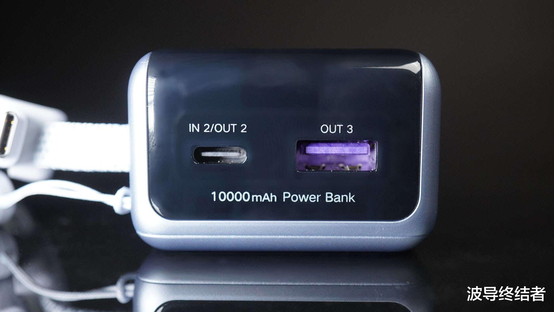 别看这款充电宝小巧,它一共有3个输出接口,刚才看到的自带的Type-C线已是一个,另外还有一个Type-C口,同样可以实现最大55W的快充输出功能。另外,这两个Type-C都能接受PD 45W快充的输入,没电的时候也能快速充满。另外还给了一个USB-A的接口,可以同时充3台设备。