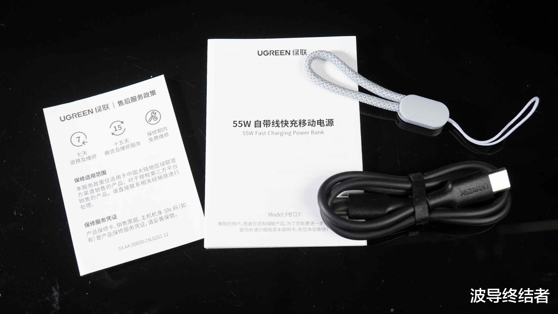 旁边这一根线,苹果同款编织工艺的,看起来像是挂绳,实际上就是自带的Type-C快充线。当然,这条线也是全功能,全功率的Type-C充电接口,对外可以输出最高55W功率,插上其他Type-C充电头也能给充电宝充电。