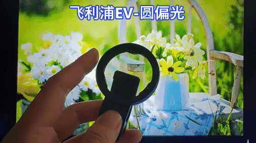 将偏振镜放到手机镜头前再旋转镜片,这种变化的过程会看着更明显,传统线偏光的显示器在偏振镜旋转到一定角度下干脆彻底变黑了,可见线偏光的缺陷。而采用了类自然光的圆偏光的飞利浦EVNIA弈威27M2N3500UK护眼屏在偏振镜旋转过程中,不论是亮度还是色彩这些都依然保持不变,可见圆偏光的优秀。