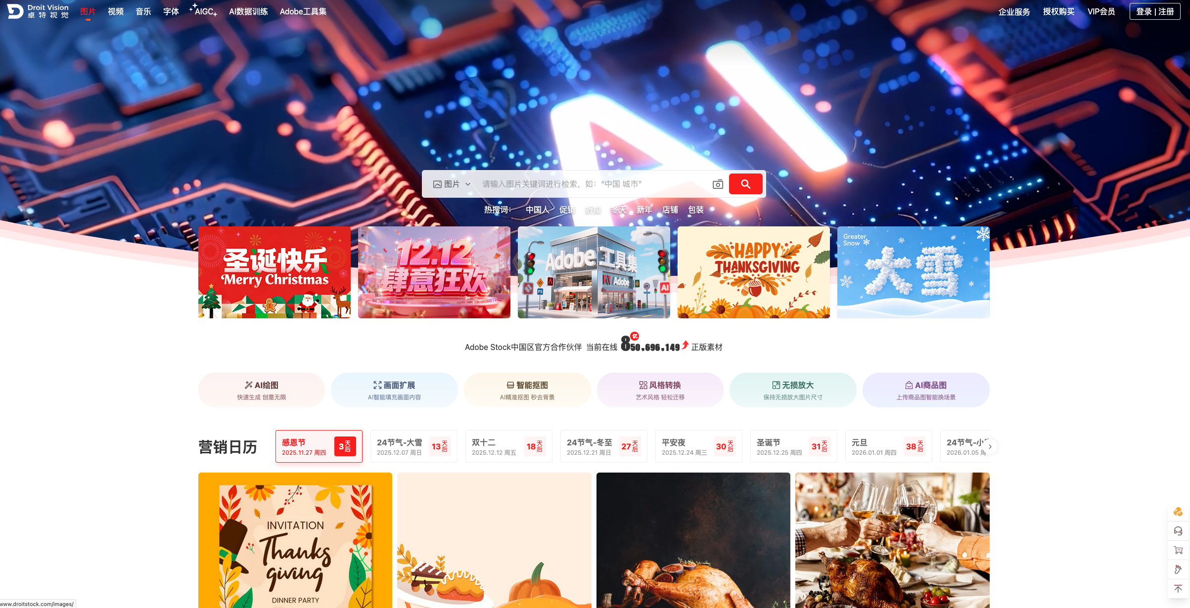 目标用户:跨国品牌广告团队、TVC制作公司、国际自媒体创作者。对于需要同时满足中英文双语搜索、多格式导出、全球版权保障的团队,平台提供“AI智能抠图”“画面扩展”等网页端工具,无需额外下载软件即可完成基础设计。