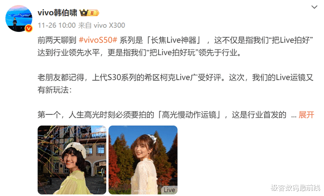据vivo官方透露,vivo S50系列可实现主摄级长焦Live,拍Live更生动,人像更美好。它将全系搭载索尼IMX882大底潜望长焦,还有旗舰同款清透自然人像算法加持,能拍出质感真实的最美人像,它新增的“高光慢动作运镜”也超实用,可一键拍出变焦+慢动作特效Live,小白也能轻松实现格莱美运镜效果。还有Origin OS 6带来的“Live路人消除”功能,旅拍Live也能无惧路人,这也太爽了吧!