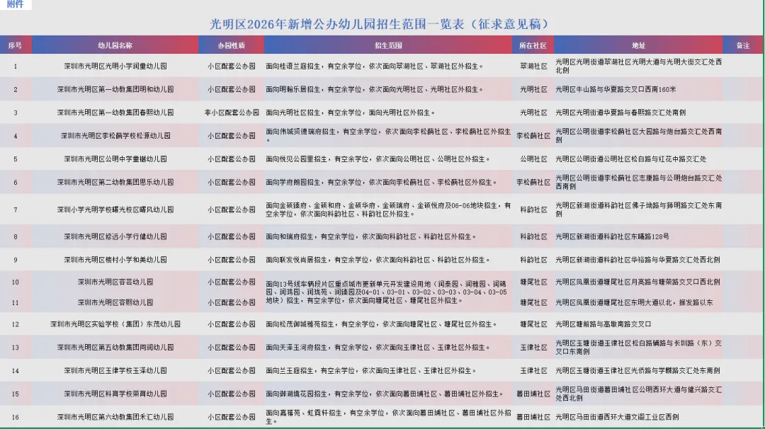 2026年深圳市光明区将新增16所公办幼儿园。1月4日,光明区教育局发布《光明区2026年新增公办幼儿园招生范围(征求意见稿)》。自发布之日起截止1月9日,公众可通过书面或电子邮件方式反馈建议。
