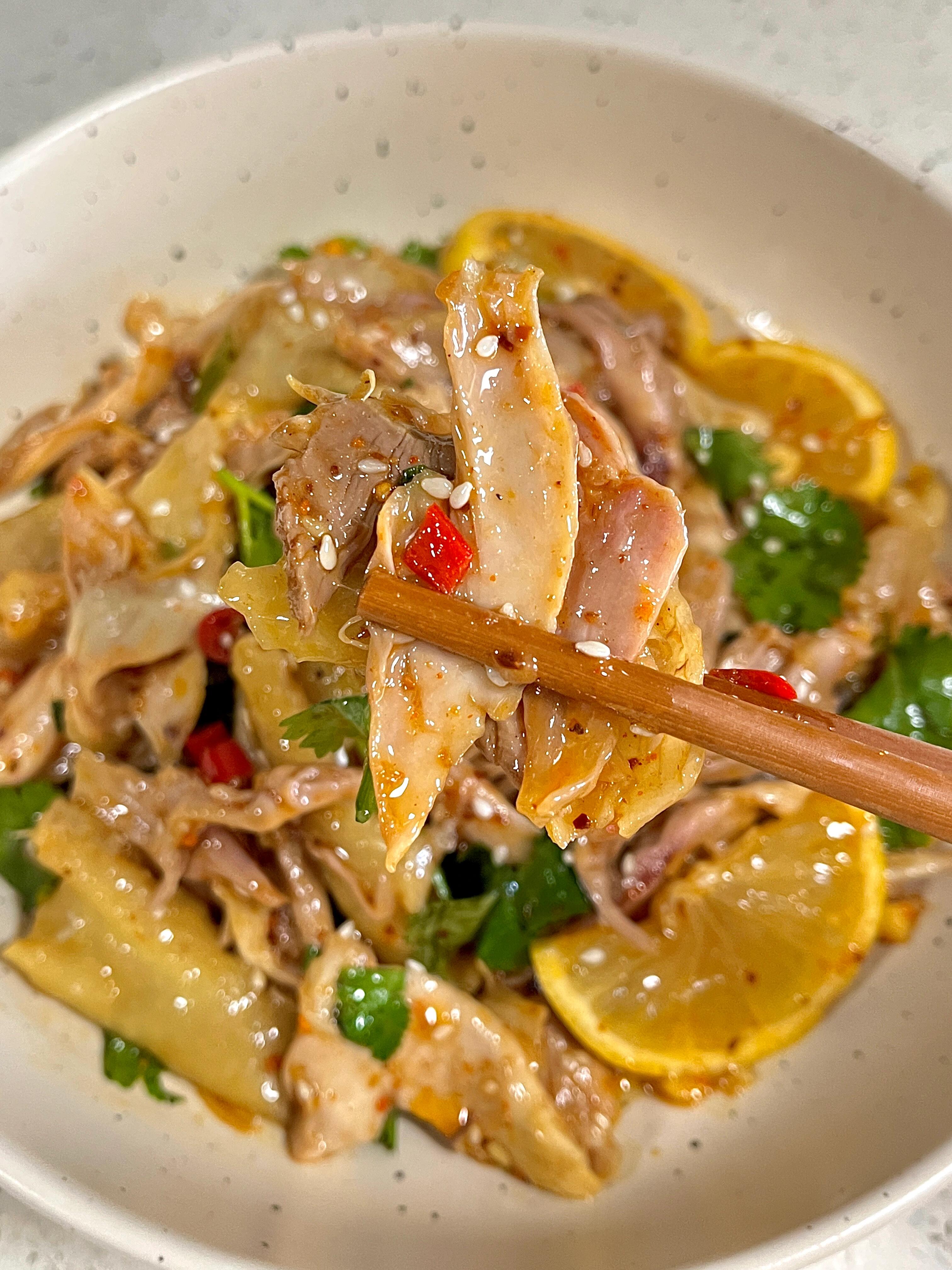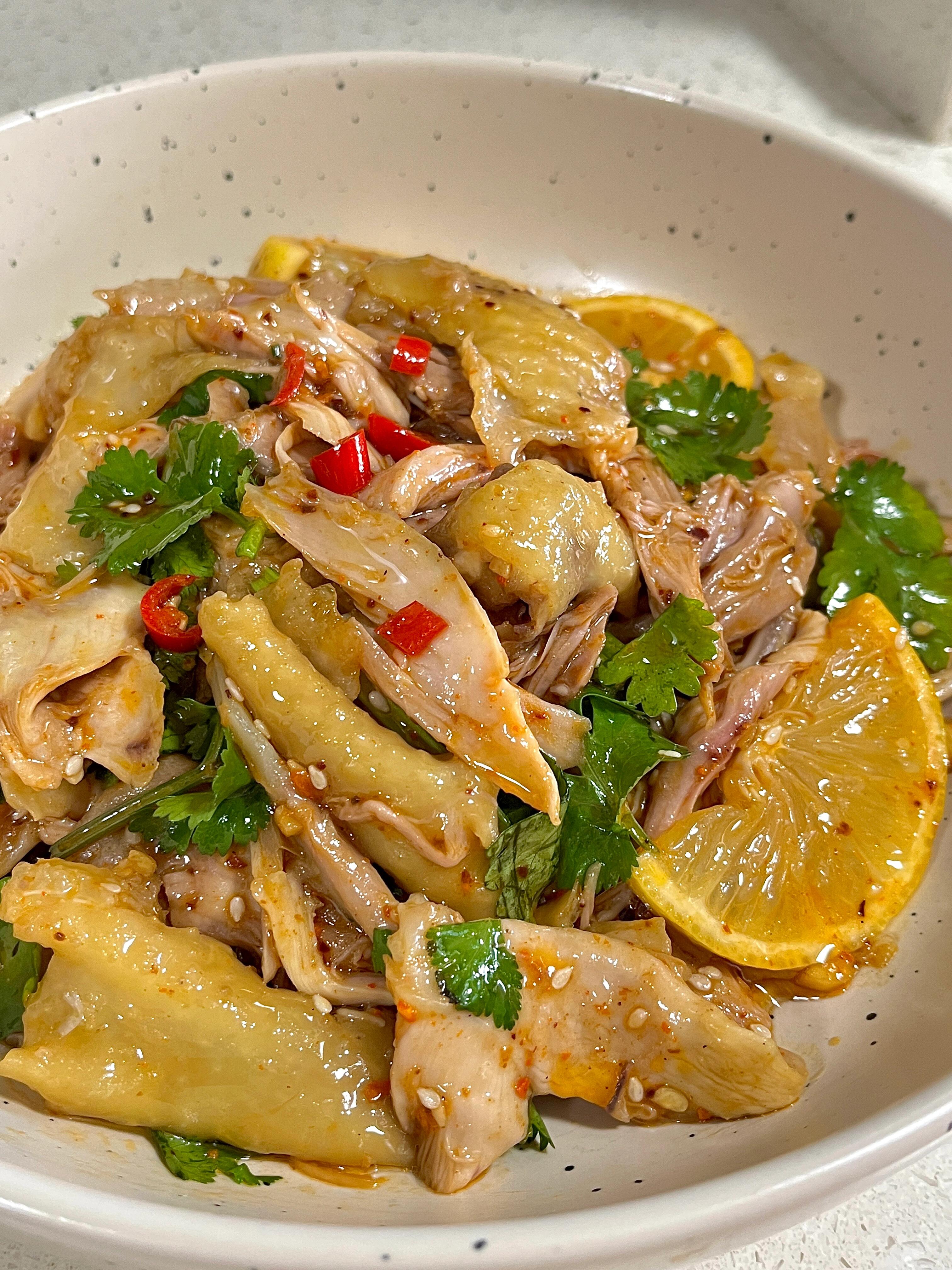 把做好的柠檬手撕鸡端上桌,那金黄的鸡肉上淋着酸甜的酱汁,还点缀着几片柠檬,看起来就特别清爽。夹起一块鸡肉放进嘴里,鲜嫩多汁的鸡肉配上酸爽的柠檬汁,瞬间唤醒你的味蕾,让你忍不住一口接一口。