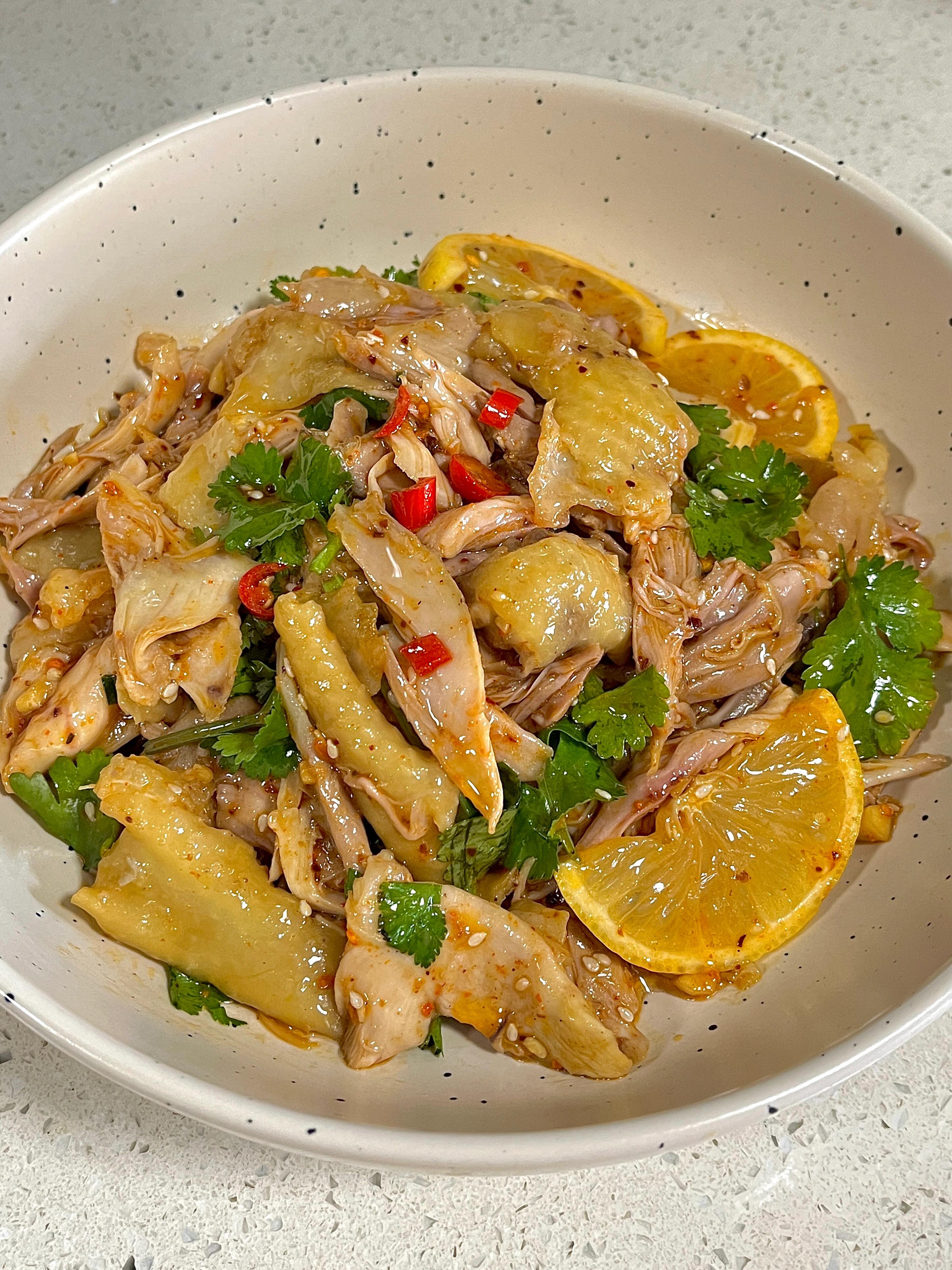最后,把调好的酱汁均匀地淋在撕好的鸡肉上,让每一块鸡肉都能充分吸收酱汁的味道。如果喜欢,还可以撒上一些葱花和柠檬片,作为装饰,让这道菜看起来更加清新诱人。