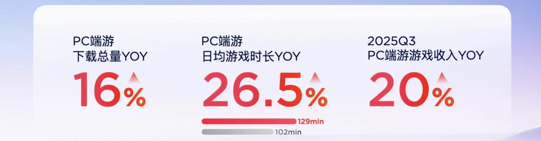 而从联想的数据看,这种回暖更为明显:今年PC端游整体下载量年增长16%,用户日均游戏时长增长26.5%,从102分钟拉升至129分钟——这意味着玩家不仅回到了PC,而且玩得更久了。