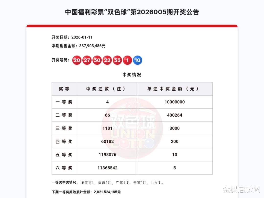 这4注千万大奖分别被 浙江、重庆、广东、云南 四地彩民揽获,延续了新年大奖分布广泛的趋势。二等奖开出66注,单注奖金400,264元,也颇为丰厚。