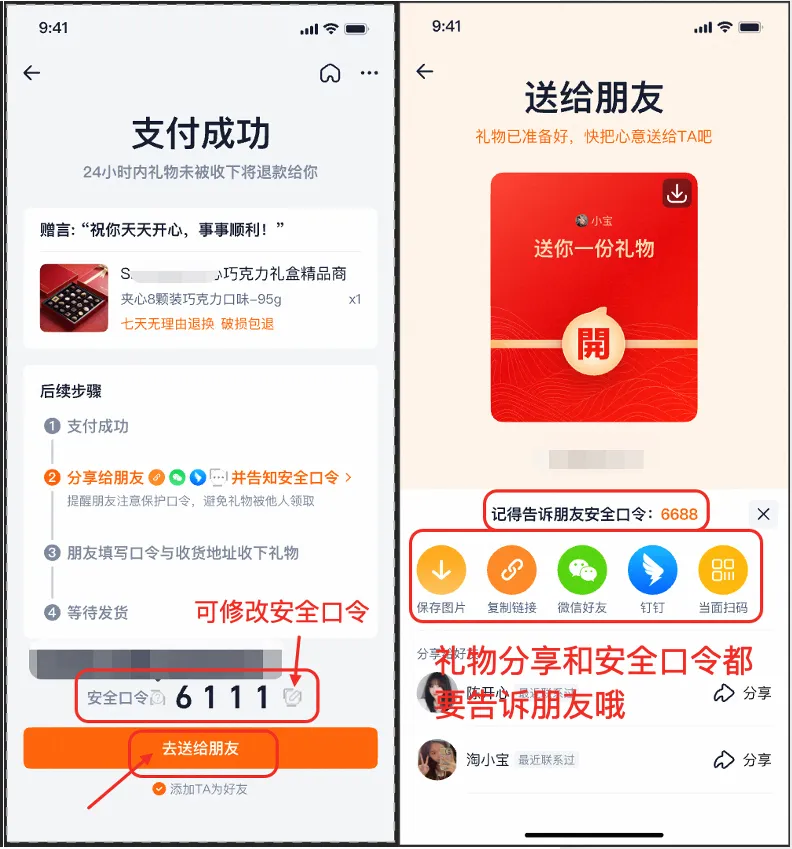考虑到安全问题,淘宝还加上了4位数的安全口令(由送礼人设置且告知对方),不输入口令是无法领取的。