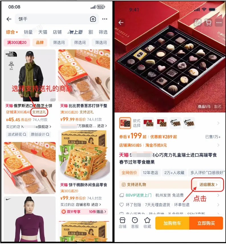 用户可以在淘宝APP商品页面,选择支持送礼的商品,点击进入后选择“送给朋友”。