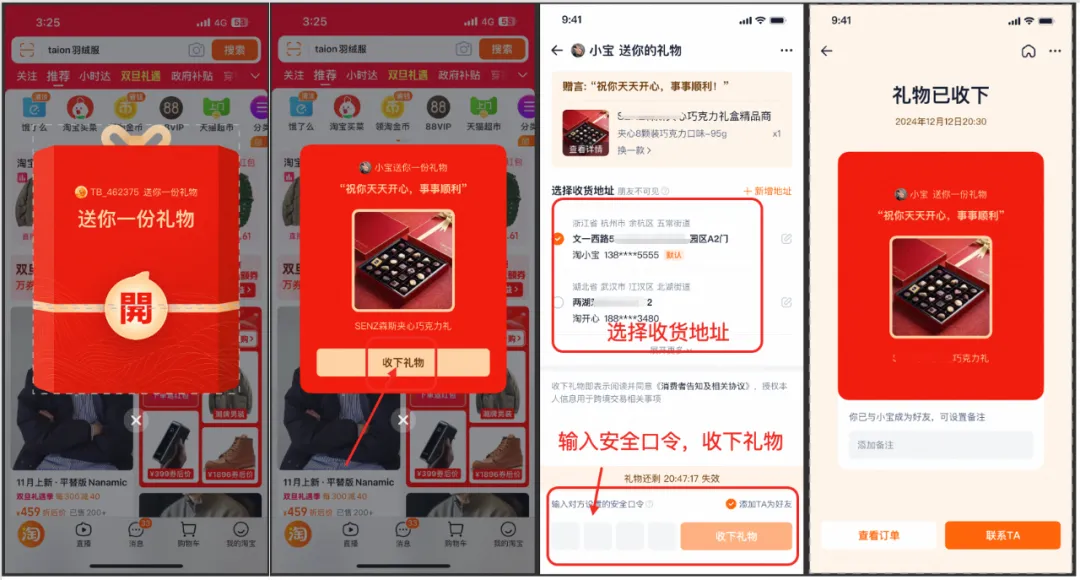 接收方复制分享链接到淘宝App,打开就可接收,随后填写收货地址(送礼方无法看见)以及输入安全口令,如此即可完成线上送礼过程。