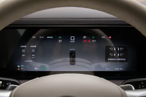 座椅、中控台饰板缝线整齐,无外露线头,针距均匀,缝线颜色与内饰配色协调。智能座舱核心为三屏 + AR-HUD,13.2 英寸液晶仪表屏分辨率较高,字体大小适中,亮度可随外界光线自动调节;17.3 英寸中控屏边框较窄,触控响应流畅,界面设计简洁,图标尺寸较大;13.2 英寸副驾娱乐屏表面做防眩光处理,支持独立操作,声音仅通过副驾扬声器输出。50 英寸 AR-HUD 投射画面清晰无重影,导航路线可投射至挡风玻璃。