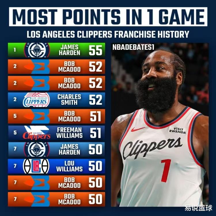 哈登则是梦回巅峰,从比赛一开始就进入个人进攻模式外线接连命中。首节就命中五记三分砍下平生涯纪录的27分,上半场更是砍下联盟赛季最高的35分。下半场依旧能够保持着手感,帮助球队连续扩大分差,让比赛失去了悬念。此役哈登打了35分钟26次出手命中17球;三分线外16中10轰下了55分3篮板7助攻1抢断的数据。同时他创下了多项纪录,更是有一项堪称为神迹。55分是快船队史纪录,也追平了联盟本赛季最高分。
