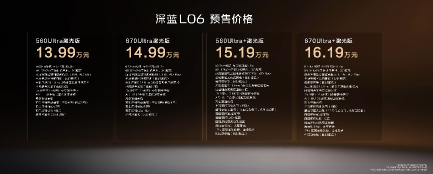 深蓝L06已正式开启预售。新车共推出四款配置车型:560Ultra激光版预售价13.99万元、670Ultra激光版预售价14.99万元、560Ultra+激光版预售价15.19万元、670Ultra+激光版预售价16.19万元,预售权益至高可享价值80259元。