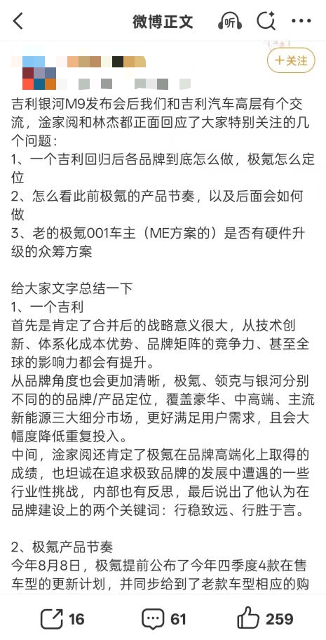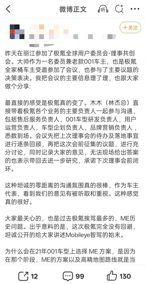 “之前总吐槽极氪,跟行业很多品牌一样只管卖新车,忘记老用户,但这次极氪愿意为老车主升级辅助驾驶系统,不管众筹成不成功,态度确实是到位了。”一位极氪001老车主评论道。类似的声音还有很多,不少用户认为,极氪在这几年新能源汽车快速迭代的过程中,虽然走过弯路,但今年开始明显“听劝”了,正在变得越来越好。