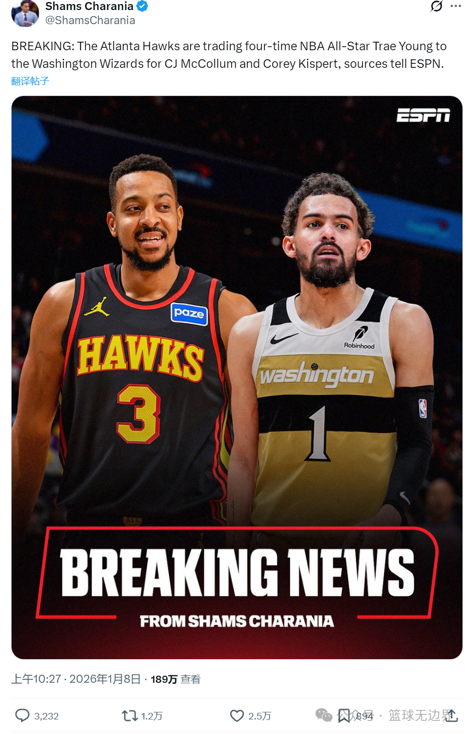 特雷-杨被交易至奇才,CJ则前往老鹰,这波操作推进迅速,此前虽有风声,但落地速度仍超出不少人预期。