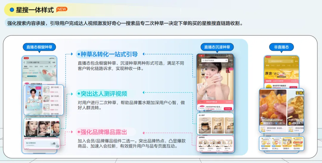 电商品专推出星搜一体新样式,突出达人种草内容在品专的展示,强化搜索内容承接,引导用户完成「达人视频激发好奇心—搜索品专二次种草—决定下单购买」的星推搜直链路转化。此外还有寻址样式,重点突出达人/KOL同款,高效承接粉丝流量;种草样式,凸显达人视频中的商品亮点,实现“种搜购”。