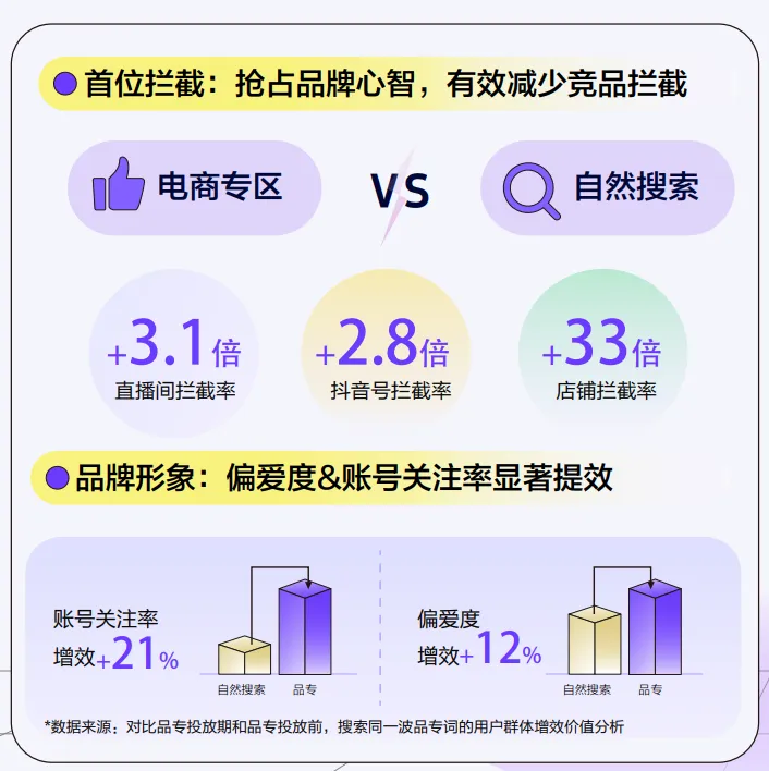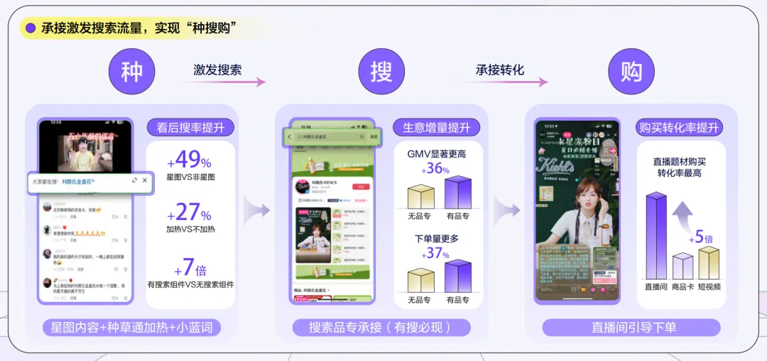 其次是“承接必需”,即品专承接住搜索流量并串联起前后链路,实现“种搜购”一体。比如巨量引擎的“星推搜直”链路,通过星图达人内容以及种草通等产品进行种草加热,挂小蓝词激发搜索,引导至电商品专首位展示直播间或商品拦截种草用户,承接种草流量实现转化。