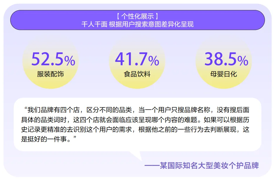 展示广告和内容推送早已实现千人千面,但很长时间里,搜索品专展示的内容都是固定的。每个用户搜索的意图都不尽相同,同样的搜索结果显然难以精准满足用户的差异化需求,从而影响进一步的转化。在益普索的品牌搜索营销调研中,许多广告主都希望品专能够根据用户意图去展现不同的内容。