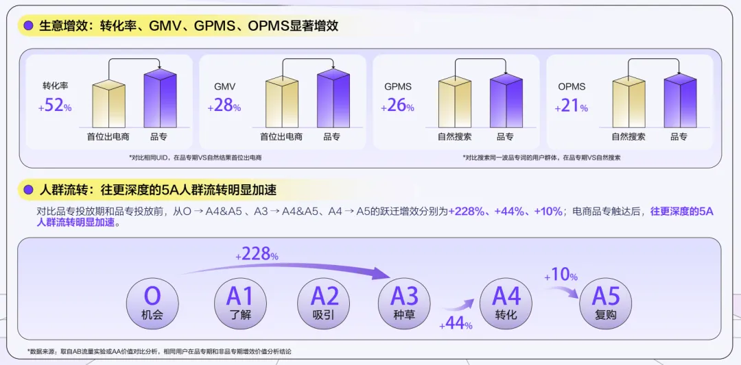 同时,搜索品专是品牌的“经营必选”。一方面能够带来确定的生意增效,数据显示品专对于转化率、GMV、GPMS的提升有显著作用;另一方面品专促进品牌人群往更深度的5A人群流转明显加速,对比电商品专投放前后,人群从O向A4和A5跃迁增效达228%,A3向A4增长44%,A4向A5增长10%。