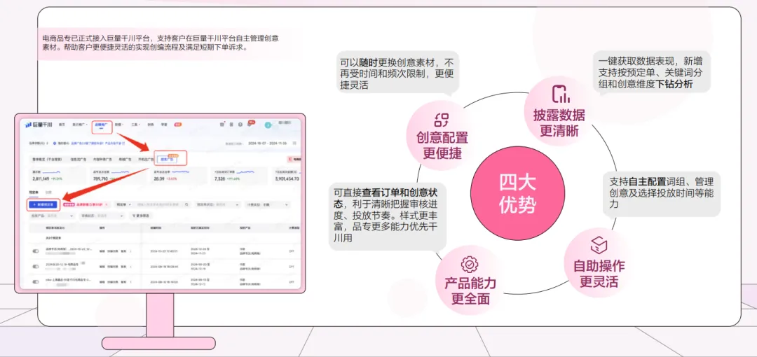 目前电商品专已正式接入巨量千川,支持客户自主管理创意素材,不仅操作更便捷灵活,而且产品能力也更加全面,帮助客户更便捷灵活地实现创意配置、获取数据分析及满足短期下单诉求。同时,巨量云图支持客户自主选词,轻松筛选「必买词」「推荐词」「潜力词」,以强化品牌信息传达的精准性与个性化。