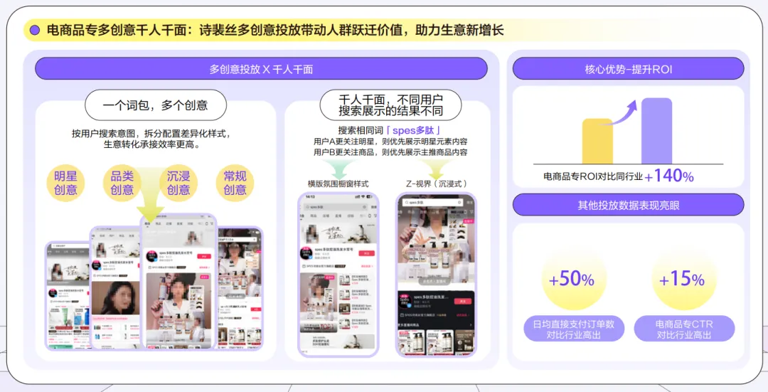 顺应广告主的需求,今年巨量引擎推出了电商品专的个性化样式,会根据用户搜索词型、历史消费行为等判断搜索意图,结合对应的营销场景进行个性化品专样式展示,实现了品专展示的千人千面。相较于单一样式的品专,个性化样式能够有效提升首屏GMV和ROI,某日化品牌采用品专个性化展示后首位GMV提升46%、首位订单量提升83%。