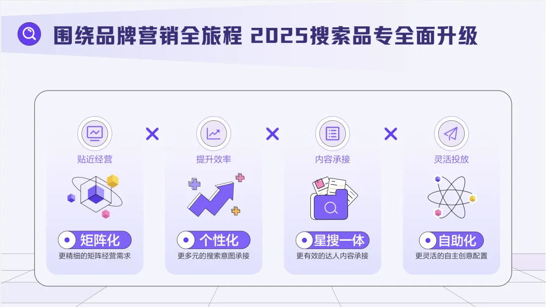 与以上四大趋势相呼应,巨量引擎搜索品专在2025年将围绕品牌营销全旅程,从矩阵化、个性化、星搜一体、自助化四个方向进行升级,让搜索品专“有搜必现、承接必需、经营必选”三大核心价值得到更好的发挥和利用。