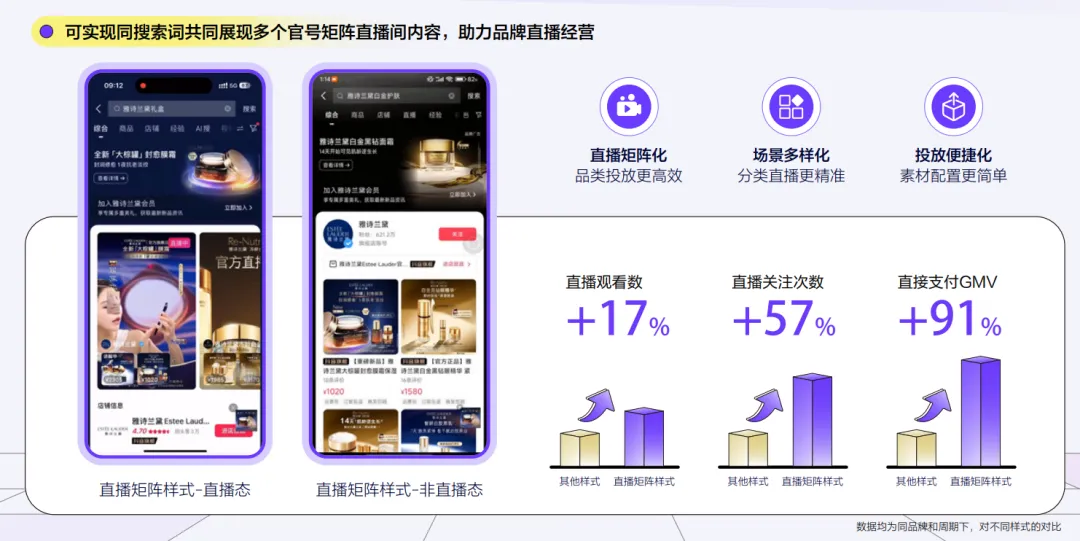 首先是一客多店,支持一个词包由多家店铺承接或者不同词包由不同店铺承接,从而更精准地承接用户搜索需求,相较一客一店CTR能提升31%、ROI提升18%。其次是直播矩阵品专样式,支持同一搜索词下共同展现多个官号矩阵直播间内容,可实现生意的多重曝光,助力品牌直播经营。相较其他样式,直播关注次数提升57%,直接支付GMV提升91%。