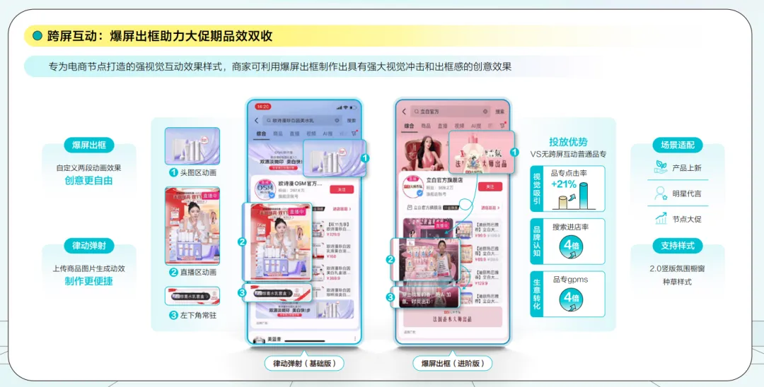 此外,除了从展示结果上更加贴近用户需求,搜索品专在视觉的丰富度和吸睛度上也不断升级,以强视觉动效锁定用户注意力,助力大促期品效双收。比如,专为电商节点打造的跨屏互动新样式,包括基础版的律动弹射和进阶版的爆屏出框等不同效果,以动态视觉吸引和新鲜互动创意,吸引用户停留和点击。