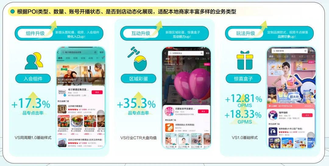 巨量引擎本地品专支持根据POI类型、数量、账号开播状态、是否到店动态化展现,适配本地商家丰富多样的业务类型,比如有会员拉新需求的商家可使用「入会组件」,商家还可根据区域设置「区域彩蛋」增强用户互动感,搜索承接更精细。同时,本地品专支持定向城市,商家可根据经营范围投放,有效控制预算。