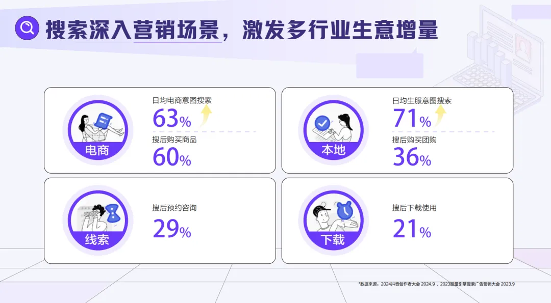 同时,搜索与商家生意的关联愈加紧密,抖音用户的日均电商意图搜索增长了63%,生活服务意图搜索增长了71%,而且用户的搜索动作很多都导向各种消费行为——60%用户在抖音有过搜索后购买商品的行为,36%用户在搜索后购买过团购类商品,29%用户有过搜索后预约咨询,21%用户有过搜索后下载使用。