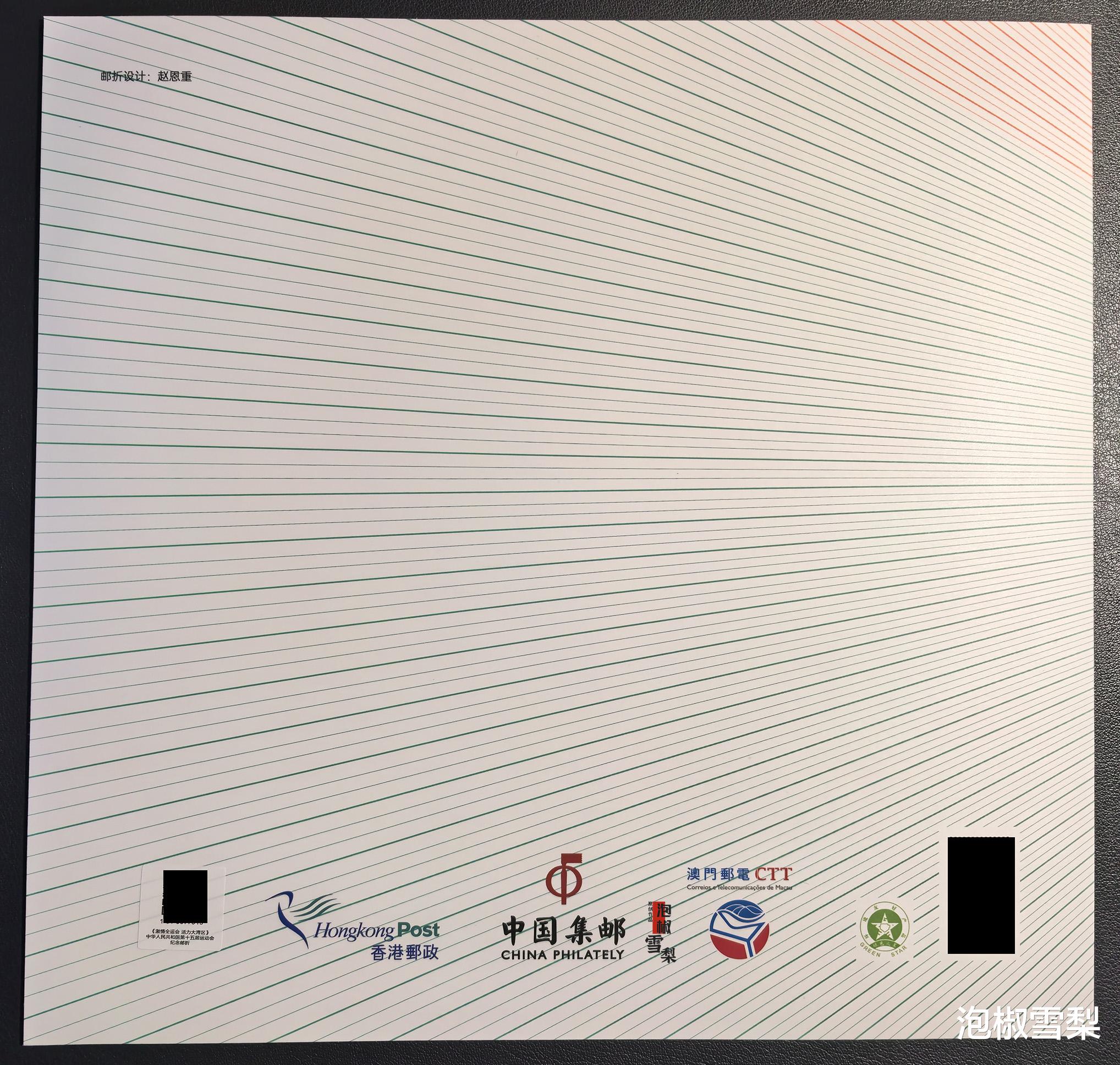 邮折背面印有可在邮政APP扫描的二维码,并有中国集邮、香港邮政、澳门邮电三地标识。