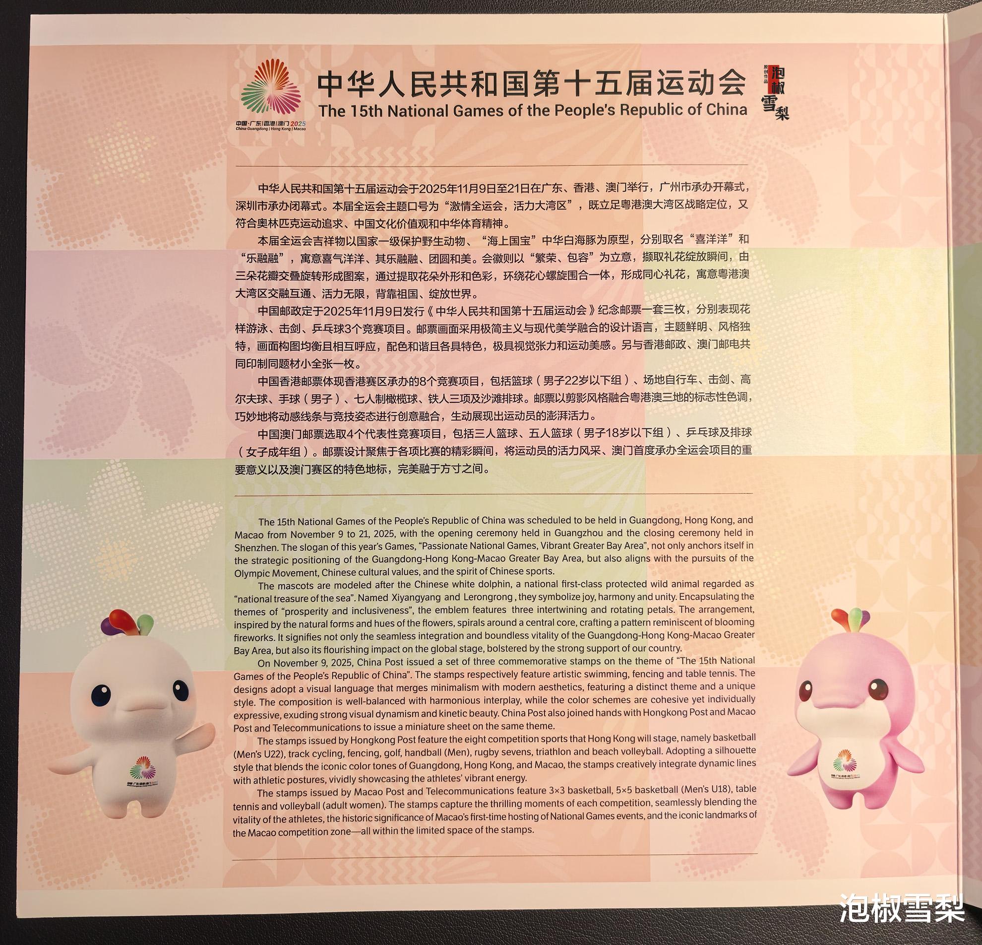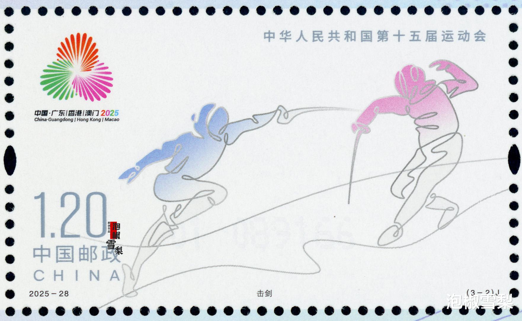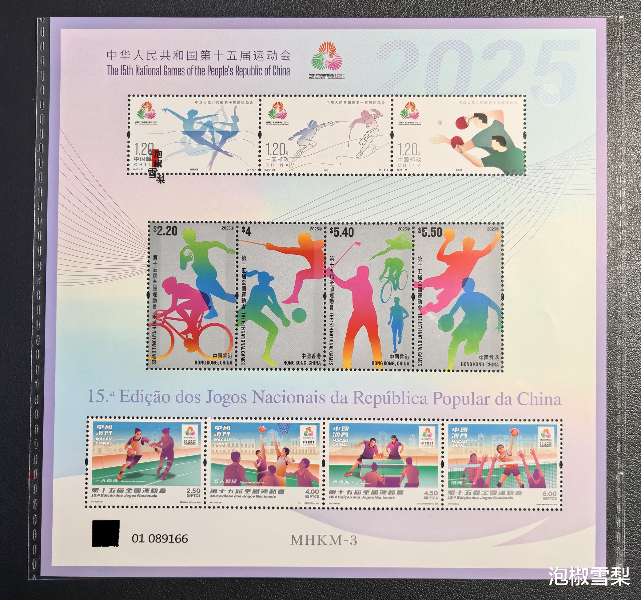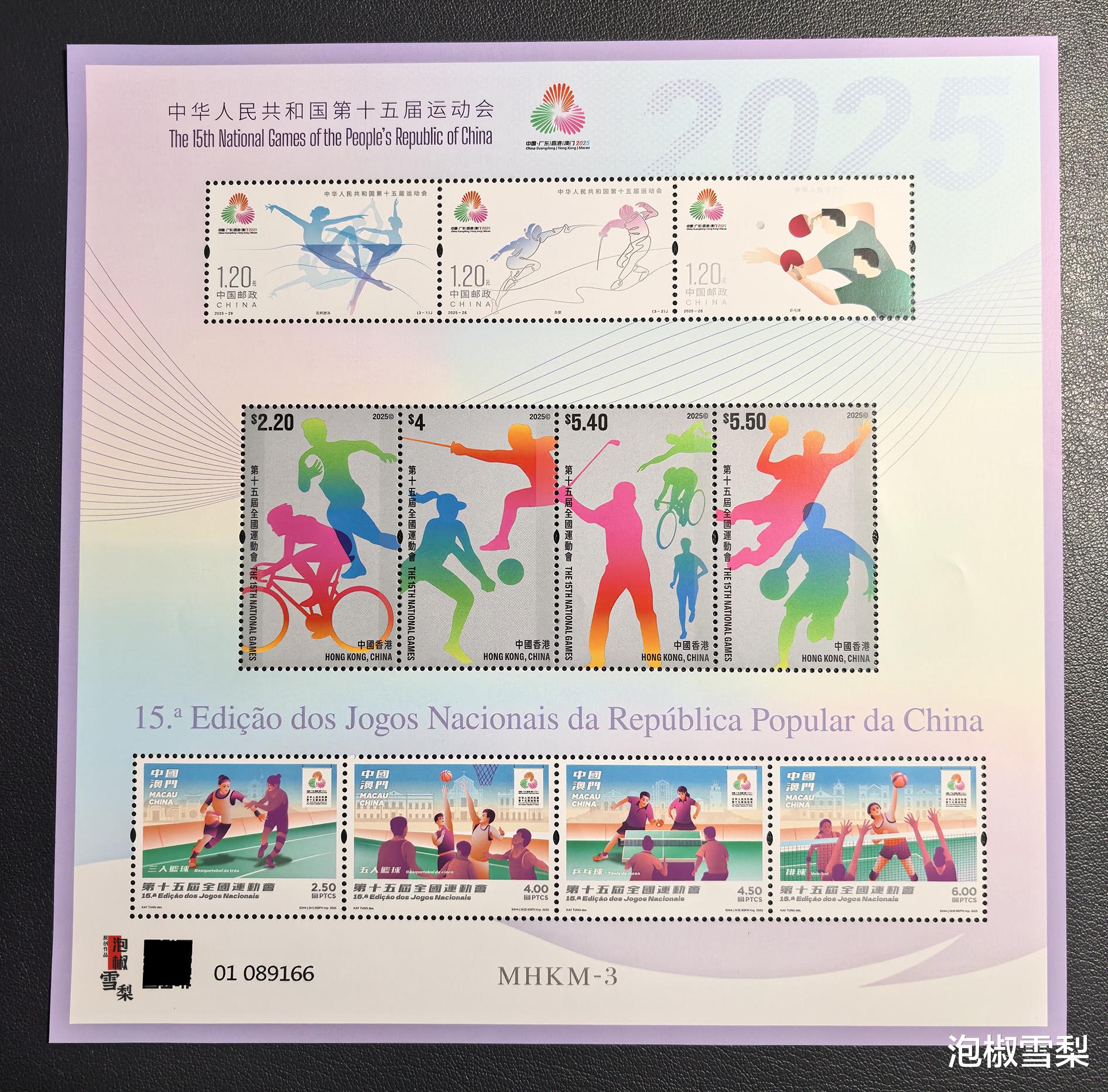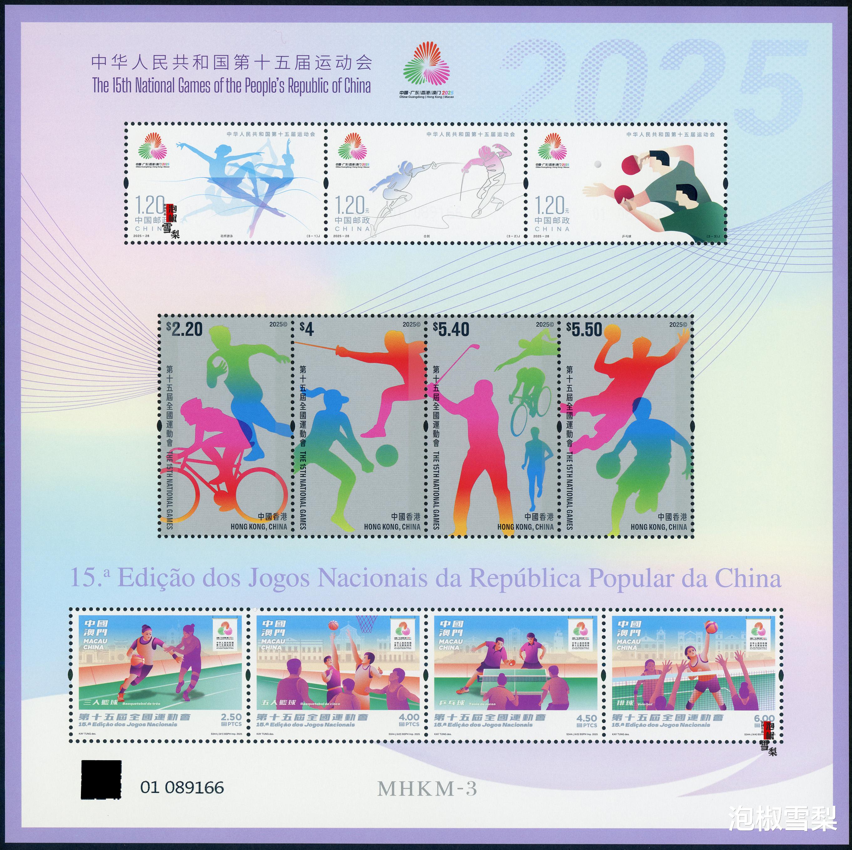 2025年11月9日,中国邮政发行《中华人民共和国第十五届运动会》邮票1套3枚,另与香港邮政、澳门邮电共同发行同题材三地小全张1枚,北京邮票厂胶版印刷,中国邮政计划发行量10万版,港澳地区发行量另计。
