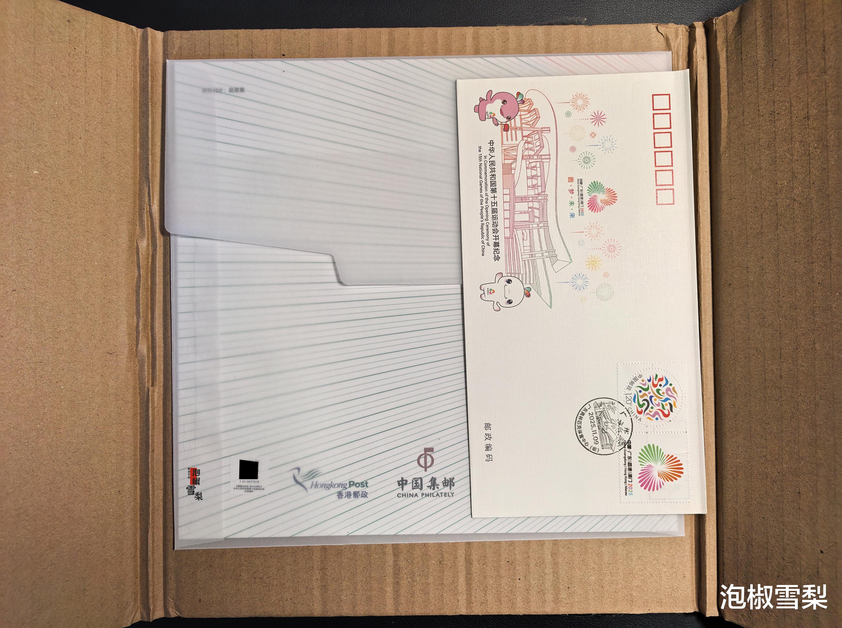 作为MHKM系列邮票的第三套,也是首次出现非生肖题材的MHKM三地小全张。泡椒雪梨所购买的是网厅三地小全张邮折和原地封套实寄的形式,比摇号的58元多出3元邮费,实际为快递包裹寄出,原地信封则夹在邮折包装中。