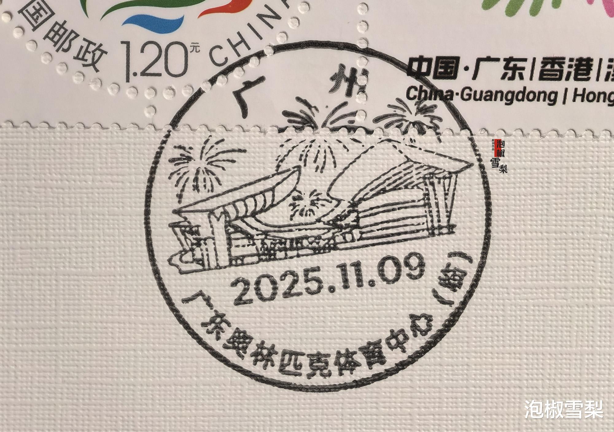 邮戳为“广东奥林匹克体育中心”临时邮戳,看细节确实为真实手工盖印,且效果非常不错。