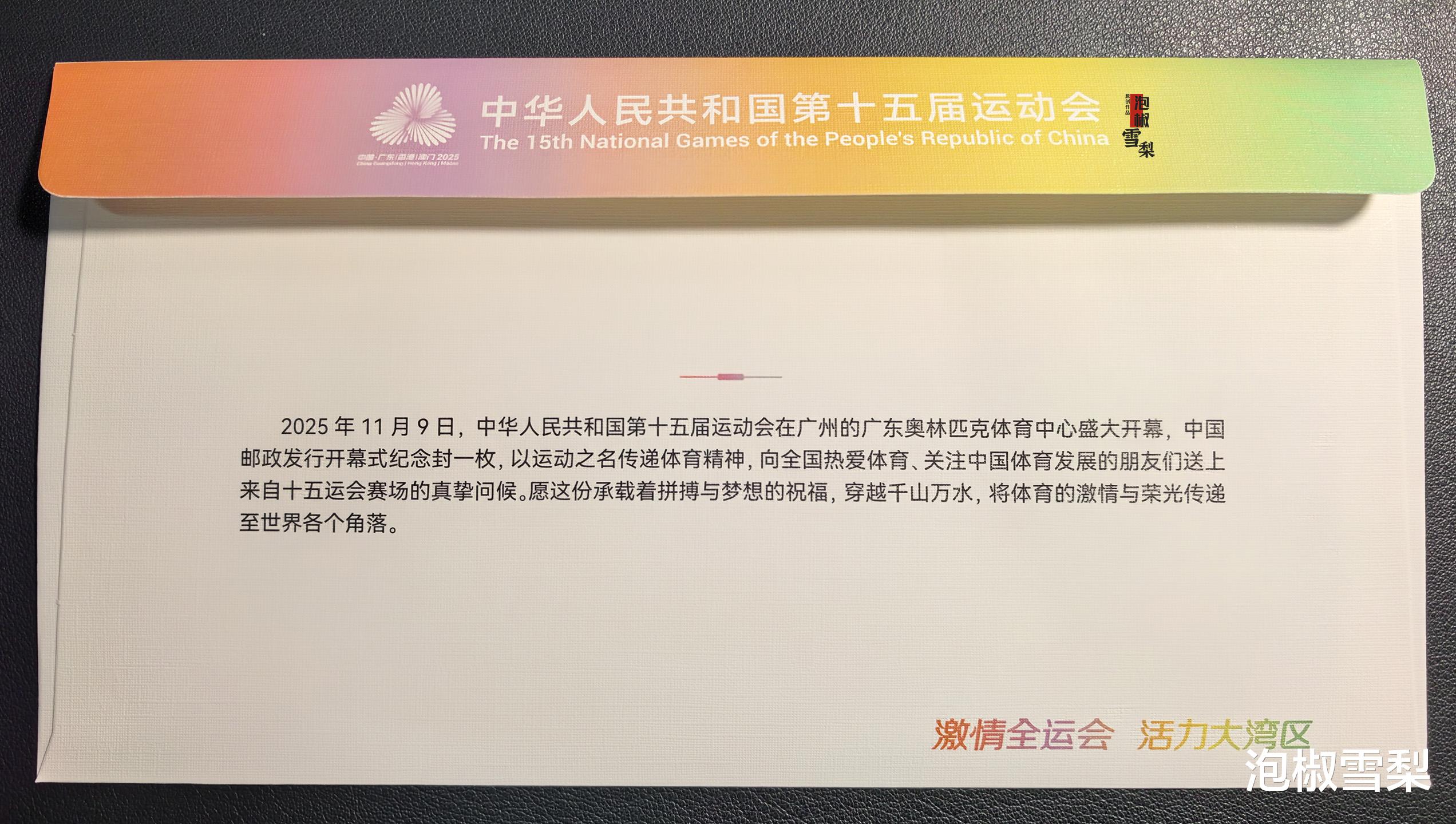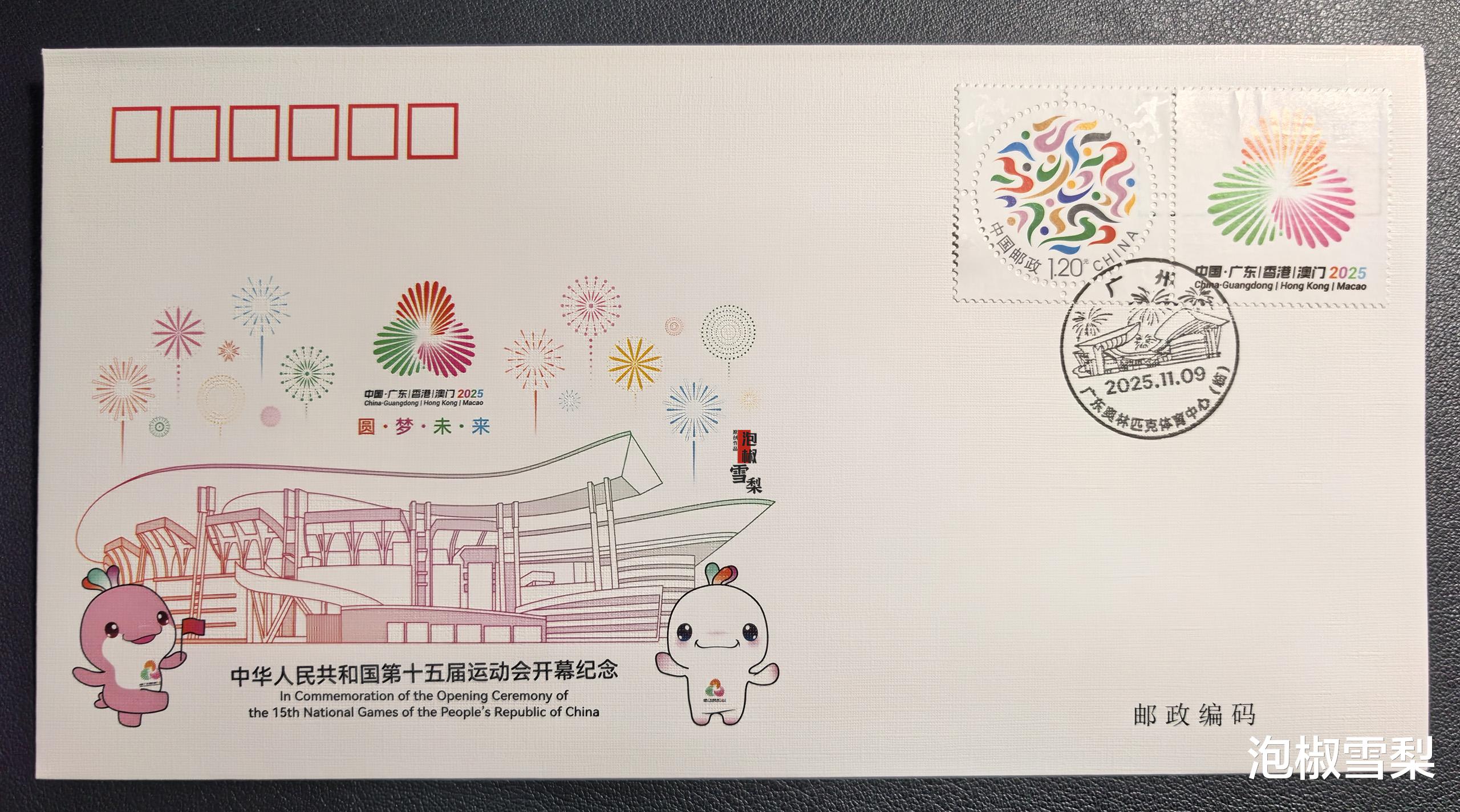 再来看纪念封,纪念封没有编号,正面右上角贴有一枚“个40”个性化邮票,副票方形,画面为2025年十五运会标志。