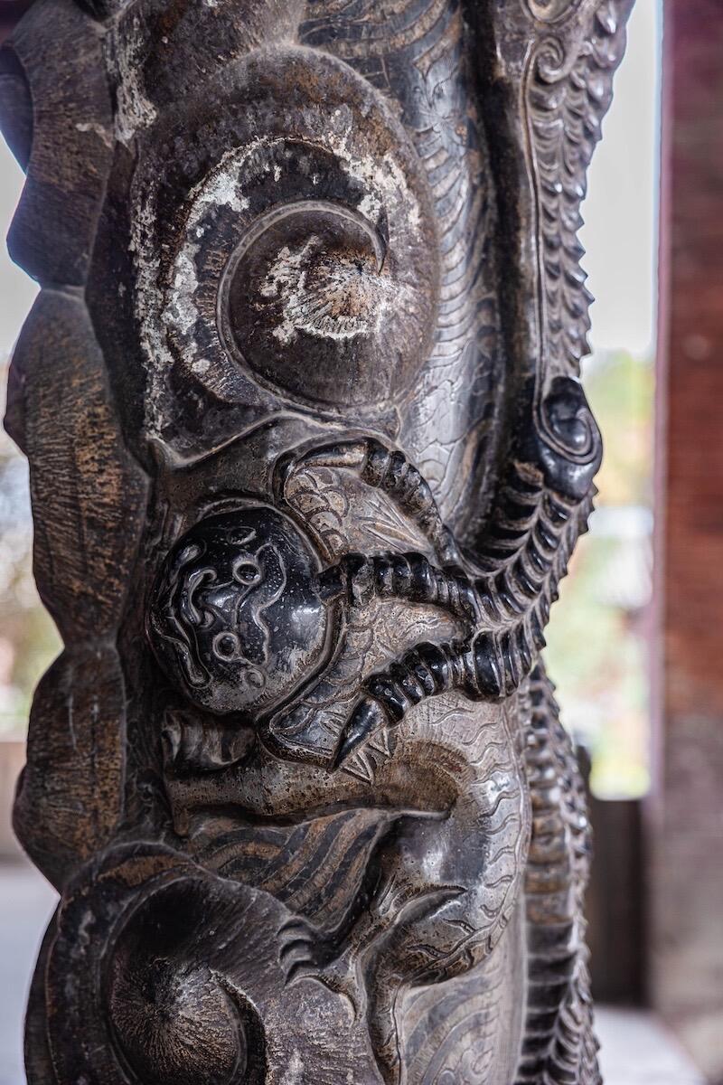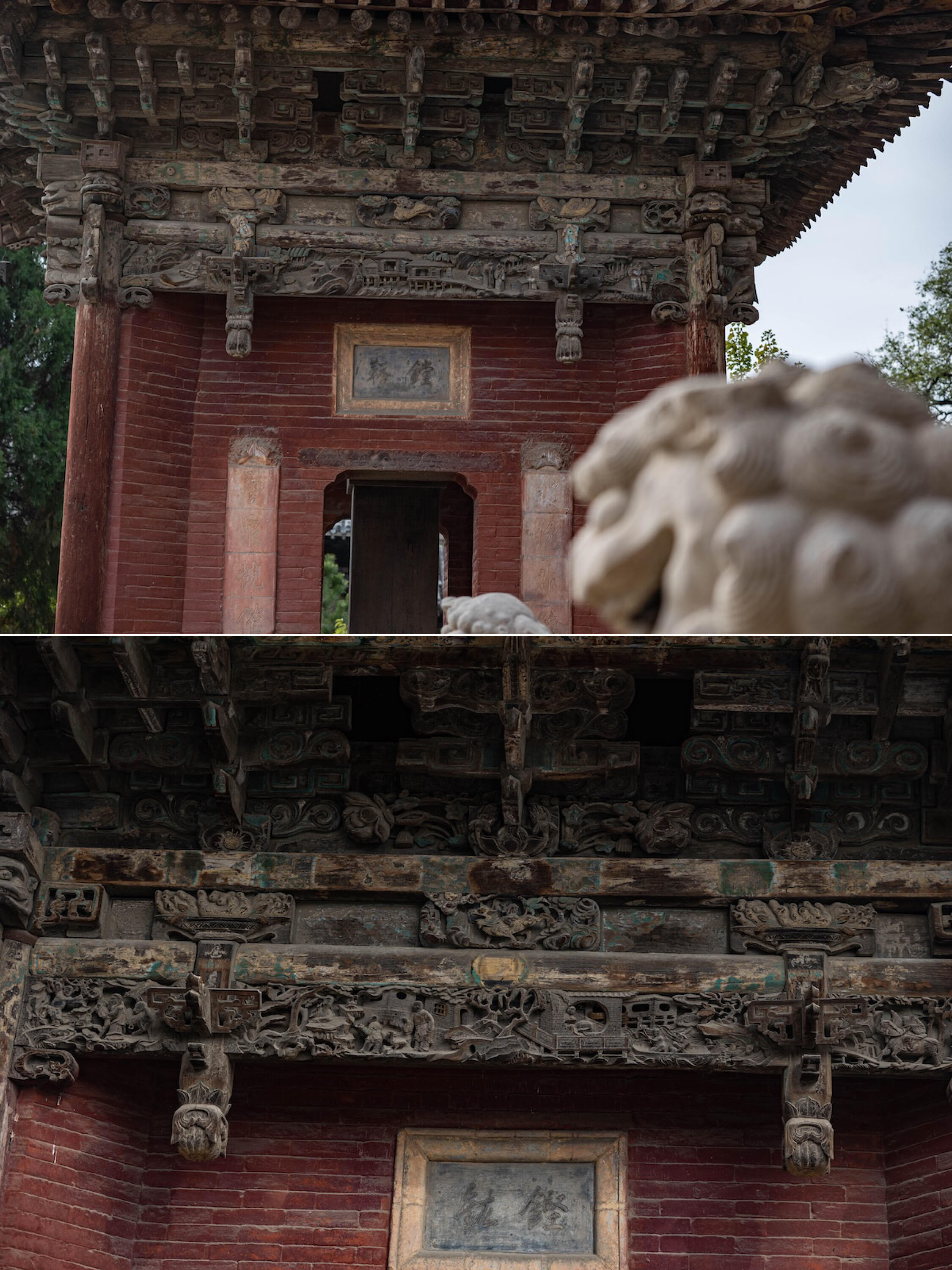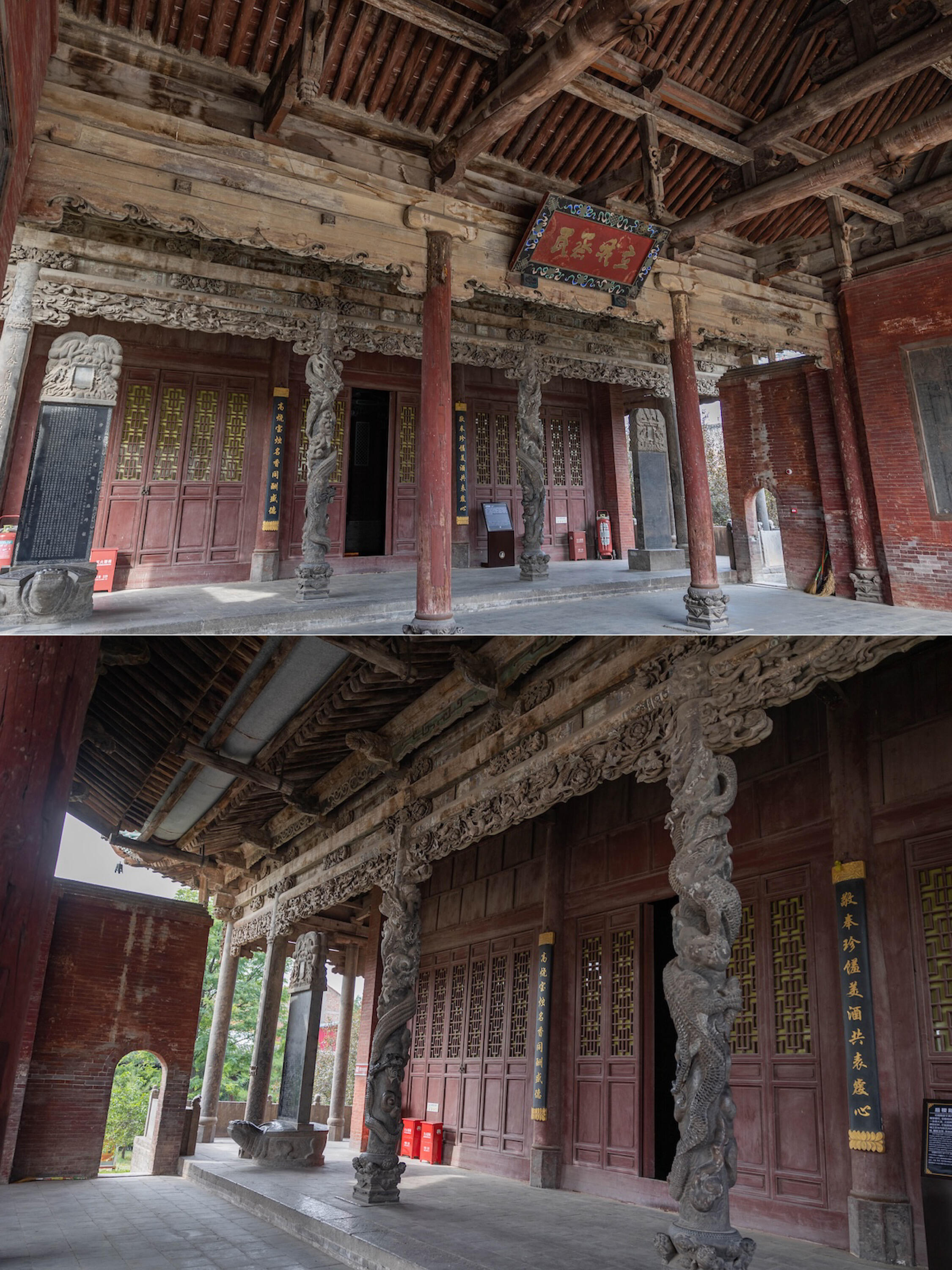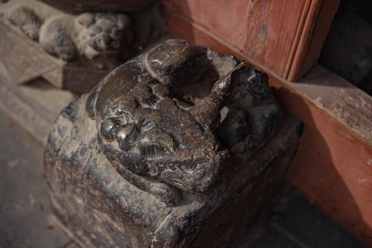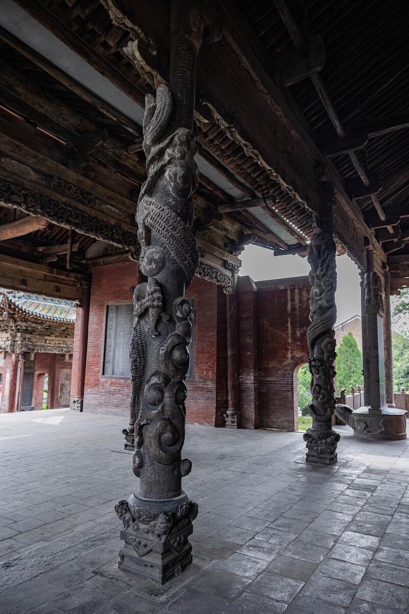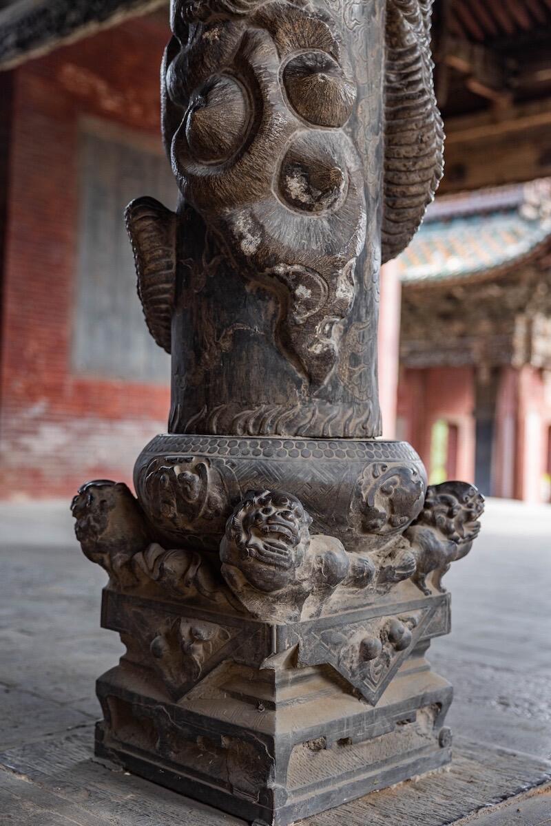 献殿前的蟠龙柱得凑近些看。龙身盘在石柱上,鳞片一片压着一片,有的地方凸起半寸,摸上去硌手。龙爪抓着云纹,指甲尖是尖的,像刚从云里探出来。最妙的是龙眼睛,用的是黑色琉璃珠,嵌在石雕里,不管从哪个角度看,都像在盯着你。柱础更热闹,狮子踩着绣球,爪子下的绒球雕得鼓鼓的;莲花瓣层层铺开,瓣尖还雕着小莲蓬,连莲子的凹槽都没落下。