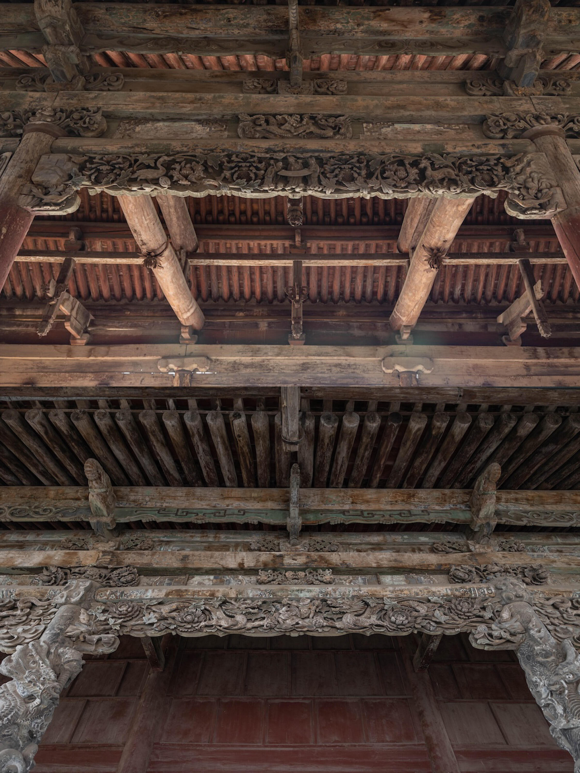 正殿的回廊要慢慢走,52块石板拼出的花卉各有各的姿态。牡丹的花瓣是层叠的,菊花的瓣尖带点卷,连叶片上的脉络都像刚被雨水洗过。柱头枋木上的耕牛最有意思,有的低头啃草,鼻子里呼出的气凝成一小团云纹;有的抬着脑袋看天,牛角弯成好看的弧线。同行的老人说,这牛是当地的黄牛品种,现在田里还能见到,只是少了木雕里那份慢悠悠的神气。