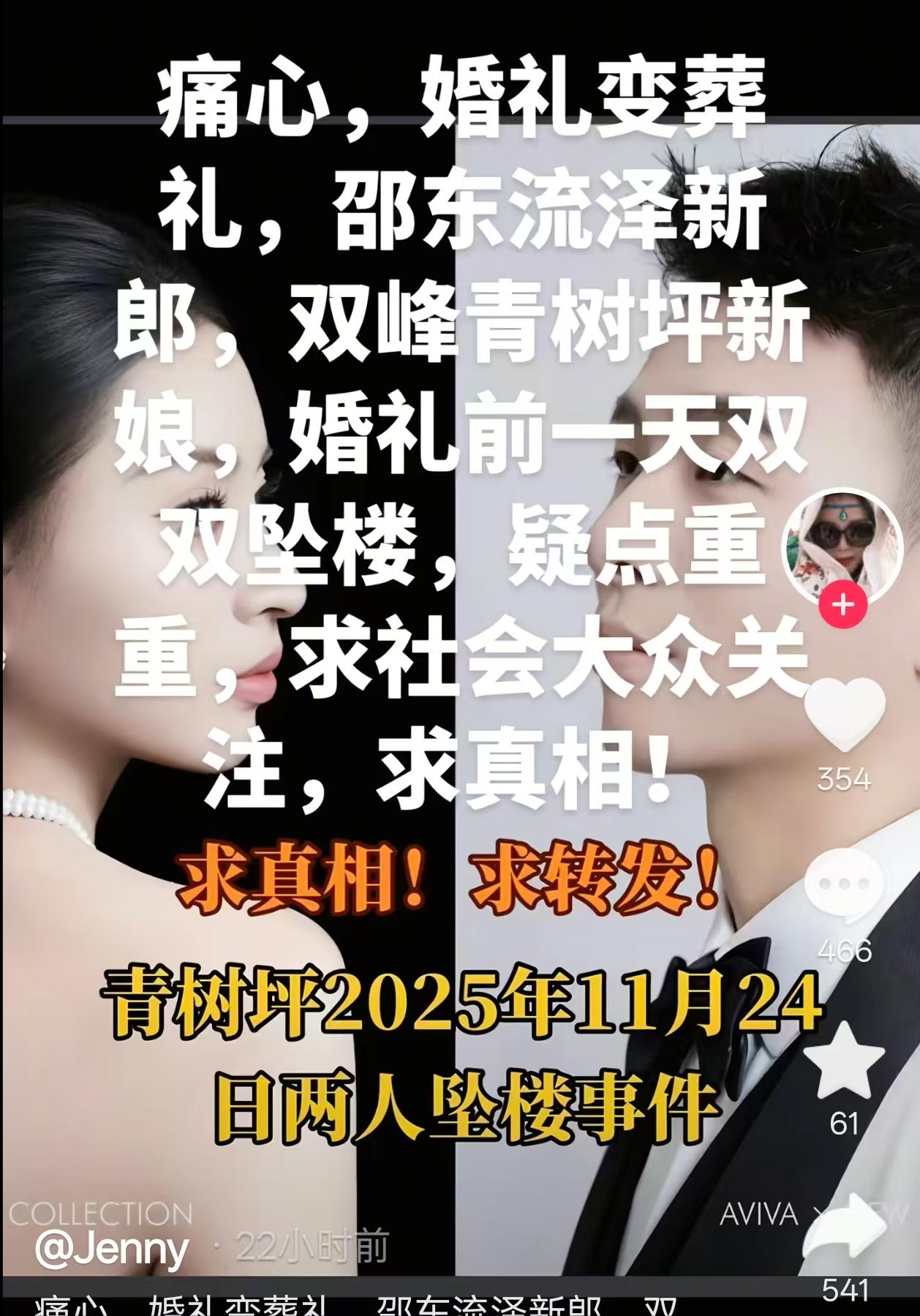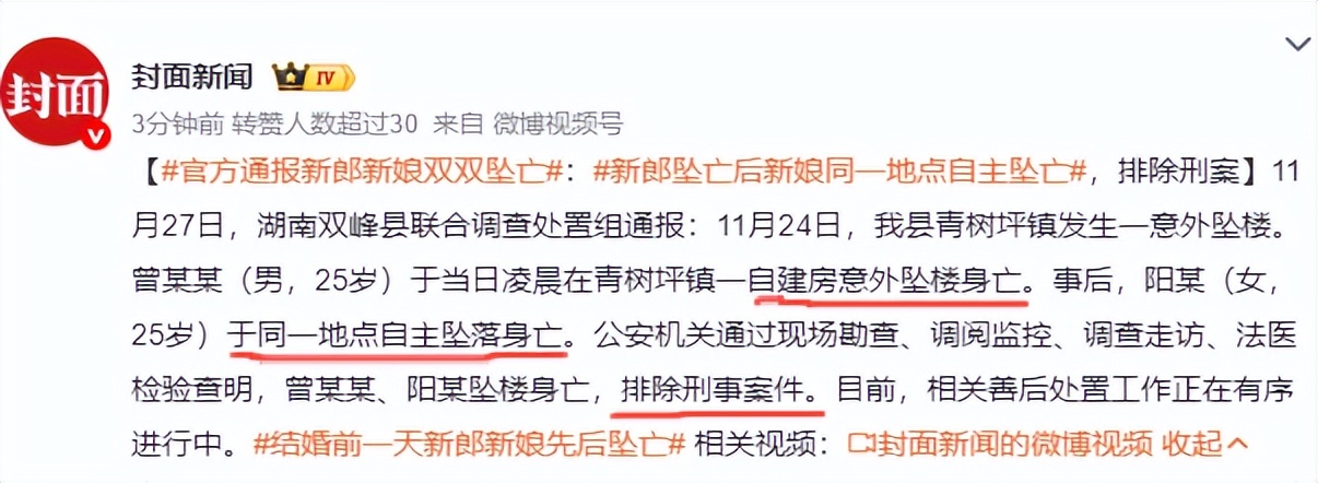 封面新闻【#官方通报新郎新娘双双坠亡#:#新郎坠亡后新娘同一地点自主坠亡#,排除刑案】