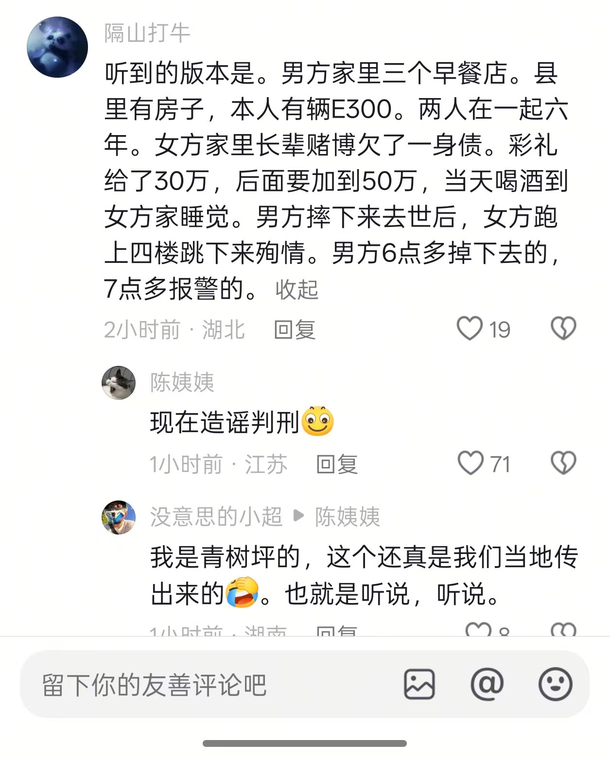 当地人有猜测是不是因为彩礼,大家要理性看待,家属已经反驳这种说法了。