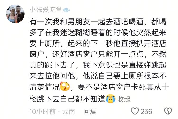 有网友是很认可的,因为有时候喝多了确实会把窗户当成门,他就有这经验,当时幸好被拉住了。