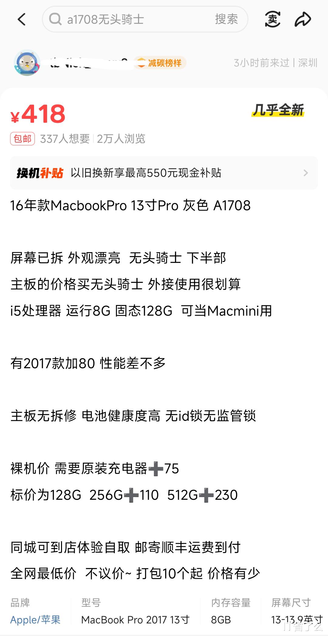 最近这段时间,我在海鲜市场刷到了一款挺特别的产品,苹果A1708无头骑士,实际上,它指的是2016款MacBook Pro把屏幕拆掉后剩下的下半部分机身,能够连接外部显示器来当作主机使用,采用i5处理器、8G内存加上128G存储这样的配置,它的标价是418元,这样的价格确实让人心里有些动摇,哪是否值得购买?我来和大家分享一些真实的想法。