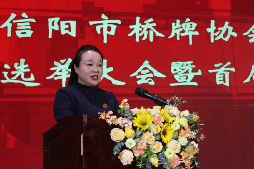 “我们将首先着力深化协会基础建设,优化内部管理,不断增强协会的凝聚力与向心力;其次,大胆创新活动形式,不仅巩固传统赛事,更将尝试引入更多元、有趣的桥牌活动,全面提升桥牌的吸引力与活力;最后,我们将致力于弘扬桥牌所蕴含的协作与竞技精神,积极打造赛事品牌,加强与外界交流,努力扩大信阳桥牌的影响力和美誉度。”信阳市桥牌协会第三届理事会理事长兼会长肖丽娜说道。她的发言务实而富有激情,为信阳桥牌的未来发展注入了明确的思路与信心。