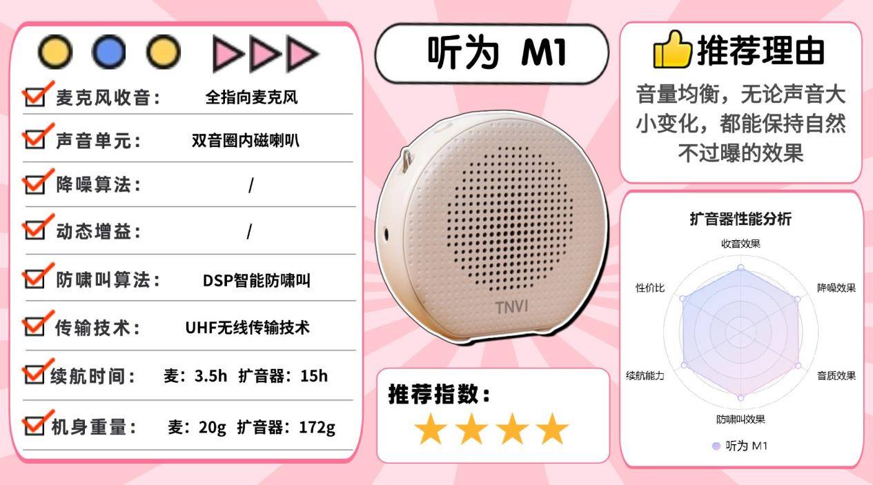 听为M1扩音器,整体由轻量级麦克风和便携扩音器组成。麦克风仅20g,支持全指向拾音,可均衡捕捉讲话者声音,DSP智能防啸叫技术,有效抑制啸叫和突发噪声,保证语音清晰自然。扩音器内置双音圈内磁喇叭,音量充足且音色饱满,适合中小型场地使用。支持UHF无线传输技术,最远传输距离约20米,同时也提供有线连接模式,兼容多种设备。续航方面,麦克风约3.5小时,扩音器可持续使用15小时,满足日常长时间使用需求。接口方面配备Type-C充电和3.5mm TRS接口,可灵活接入多种音源。