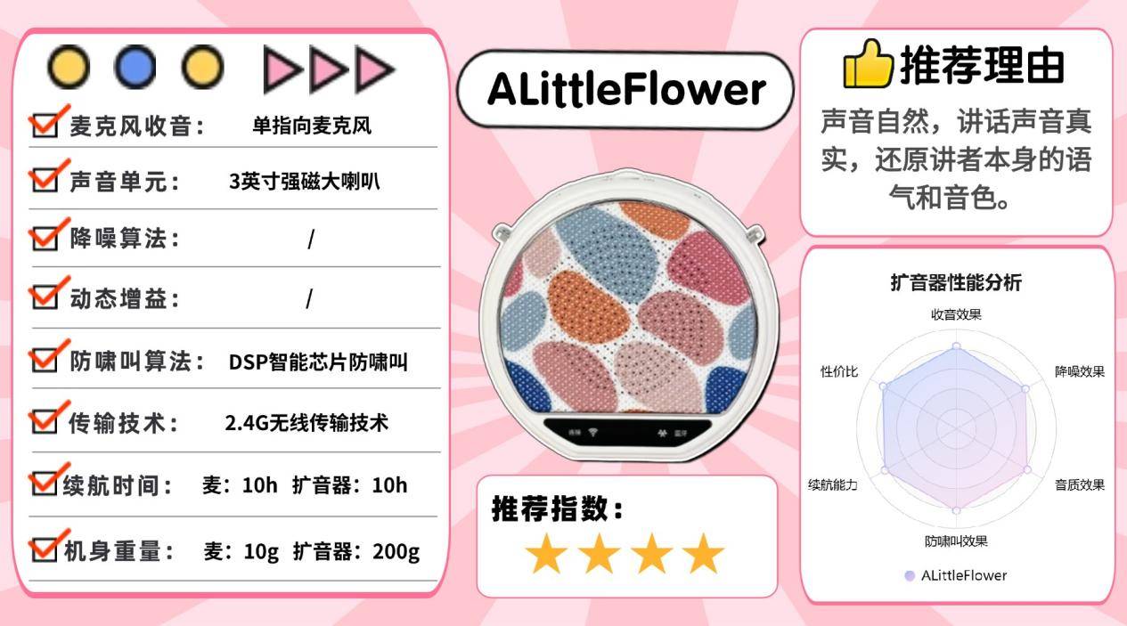 ALittleFlower KY03扩音器配备3英寸强磁喇叭,音量充足,音色饱满,可覆盖约20米范围。设备支持无线和有线两种模式,兼容多种播放设备,适用场景灵活多样。麦克风重量仅10g,采用360°全指向设计,能够均衡捕捉讲话者声音。搭配DSP智能防啸叫芯片,可有效抑制环境噪声与突发啸叫,确保语音清晰自然。续航方面,麦克风与扩音器均可使用约10小时,满足长时间使用需求。接口丰富,提供Type-C充电、3.5mm TRS接口,并支持多种播放模式及U盘直读。整体设计轻巧便携,但在较大空间内扩音器音量可能略显不足。
