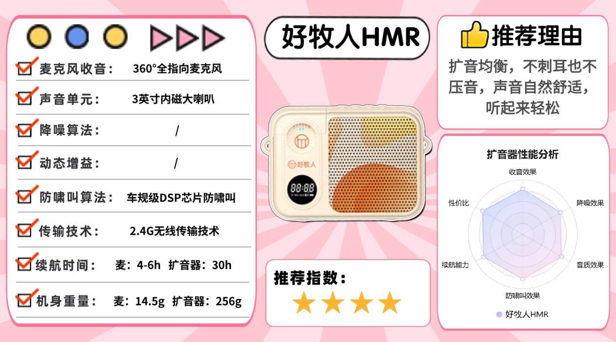 好牧人HMR扩音器,麦克风仅14.5g,支持360°全指向拾音,可均衡捕捉讲话者声音,配合车规级DSP防啸叫芯片,有效抑制环境噪声和突发啸叫,保证语音清晰自然。扩音器内置3英寸内磁大喇叭,音量充足、音色饱满,最远覆盖约30米。支持无线/有线双模式,兼容多种设备,灵活适应不同场景。续航方面,麦克风可持续使用约4-6小时,扩音器续航达30小时,满足长时间使用需求。接口丰富,Type-C充电、3.5mm TRS接口,并支持录音、蓝牙及TF卡播放。整体便携耐用,性能均衡。