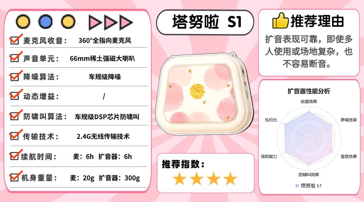 塔努啦S1扩音器,麦克风仅20g,支持360°全指向拾音,可均衡捕捉讲话者声音,同时配合车规级降噪与DSP智能防啸叫技术,有效抑制环境噪声与突发啸叫,保证语音清晰自然。扩音器内置66mm稀土强磁大喇叭,音量充足、声音饱满,适合小范围听众。支持2.4G无线传输,有效覆盖3-5米范围,也可通过有线模式使用,兼容多种设备。续航方面,麦克风与扩音器均可连续使用约6小时,满足短时使用需求。接口丰富,配备Type-C充电、3.5mm TRS接口,支持录音、TF卡、AUX及蓝牙播放。整体便携实用,但续航相对有限,长时间外出需注意充电。